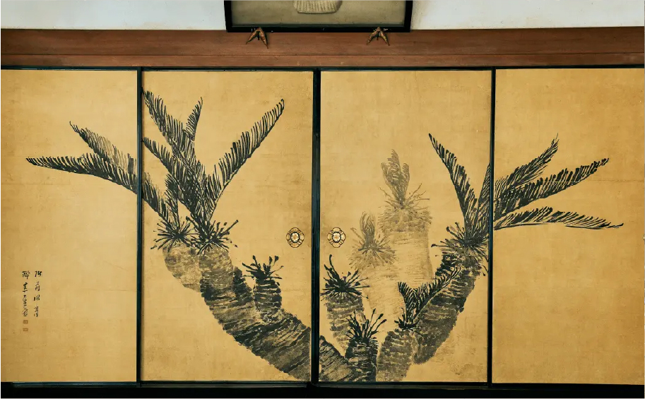 庭にある蘇鉄の様を描いた蕪村の讃岐時代の代表作であり、その優れた技量と観察眼が反映されています。明快な構図の中にある筆墨と力強い筆さばきに気魄が感じられる本作は、かつて旧本堂の襖絵として当山を見守った後、文久2(1862)年に屏風へ改装され、現在に至ります。