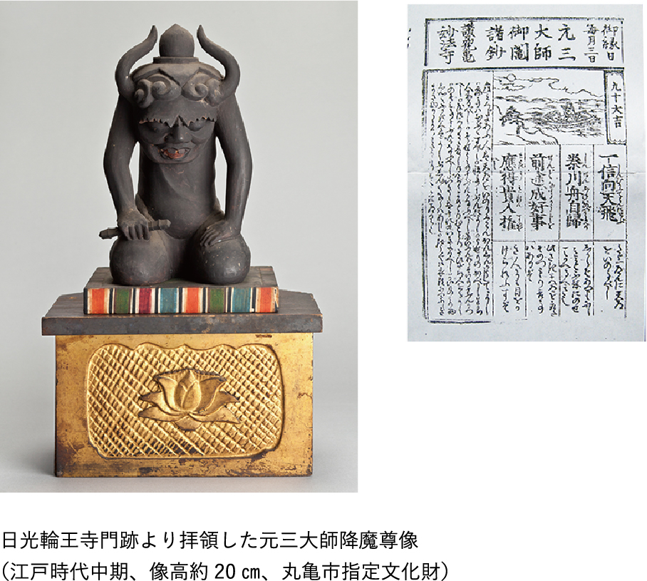 妙法寺には厄難災除・魔除守護の「元三大師降魔尊像」が奉安されています。降魔とは悪魔を降伏させるという意味で、厄除けの「角大師」として広く信仰されています。朝廷から「慈恵」の諡号を賜り、慈恵大師といわれます。正月3日に亡くなったので元三大師と尊称されるようになりました。